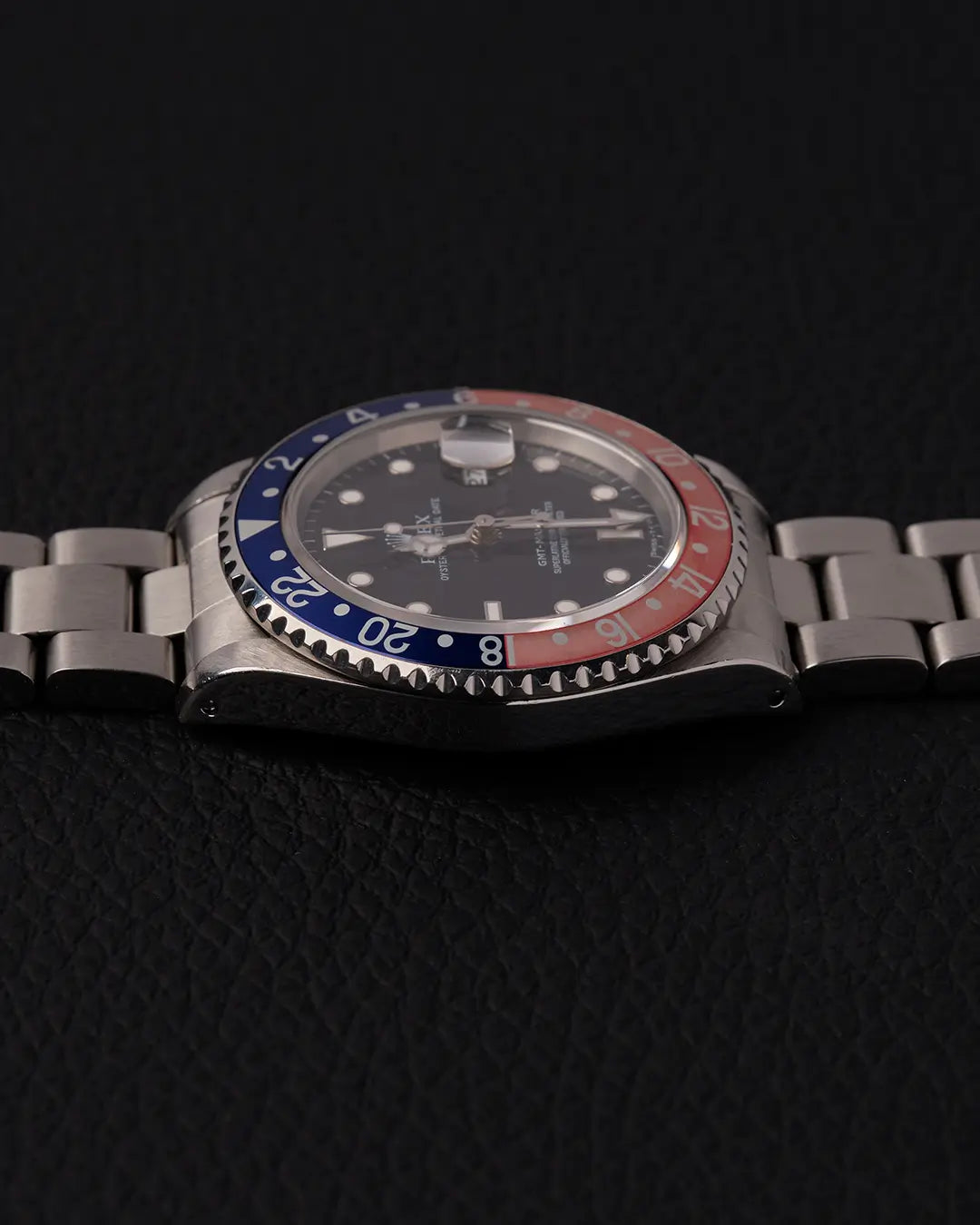 This 16700 can be seen as the prefect transitional GMT Master. The 16700 was produced along side its younger brother the GMT Master II (16710) which now could track 3 time zones instead of 2. This was done because the movement of the 16700 was cheaper to produce so a GMT Master could be offered at a lower price point. It carries the name of the original GMT Master, comes in a very modern case, has quickset date (which the 16710 hasn’t) and has the overall vintage aesthetics that we love so much.