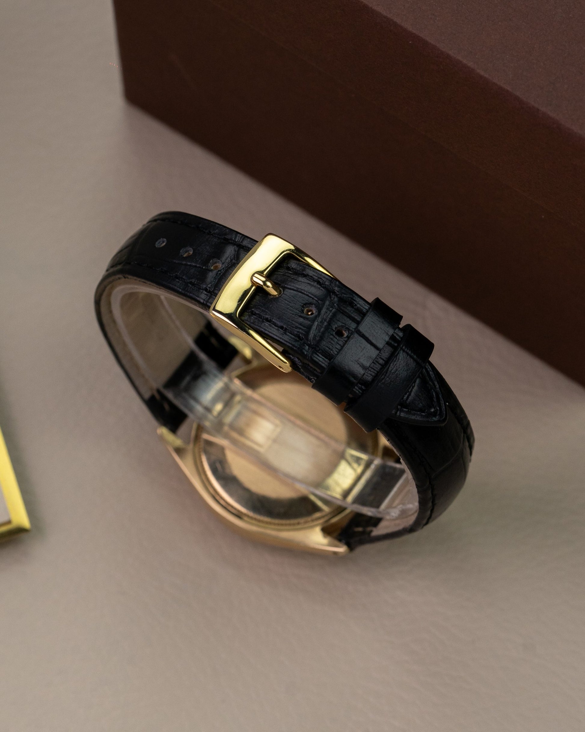 The case and hall-marks of this classic piece are sharp, and the dial is just how we want them with a dress watch. Spotless. The tritium lume plots are beautifully aged towards a cream color which blends perfectly together with the overall gold design features.