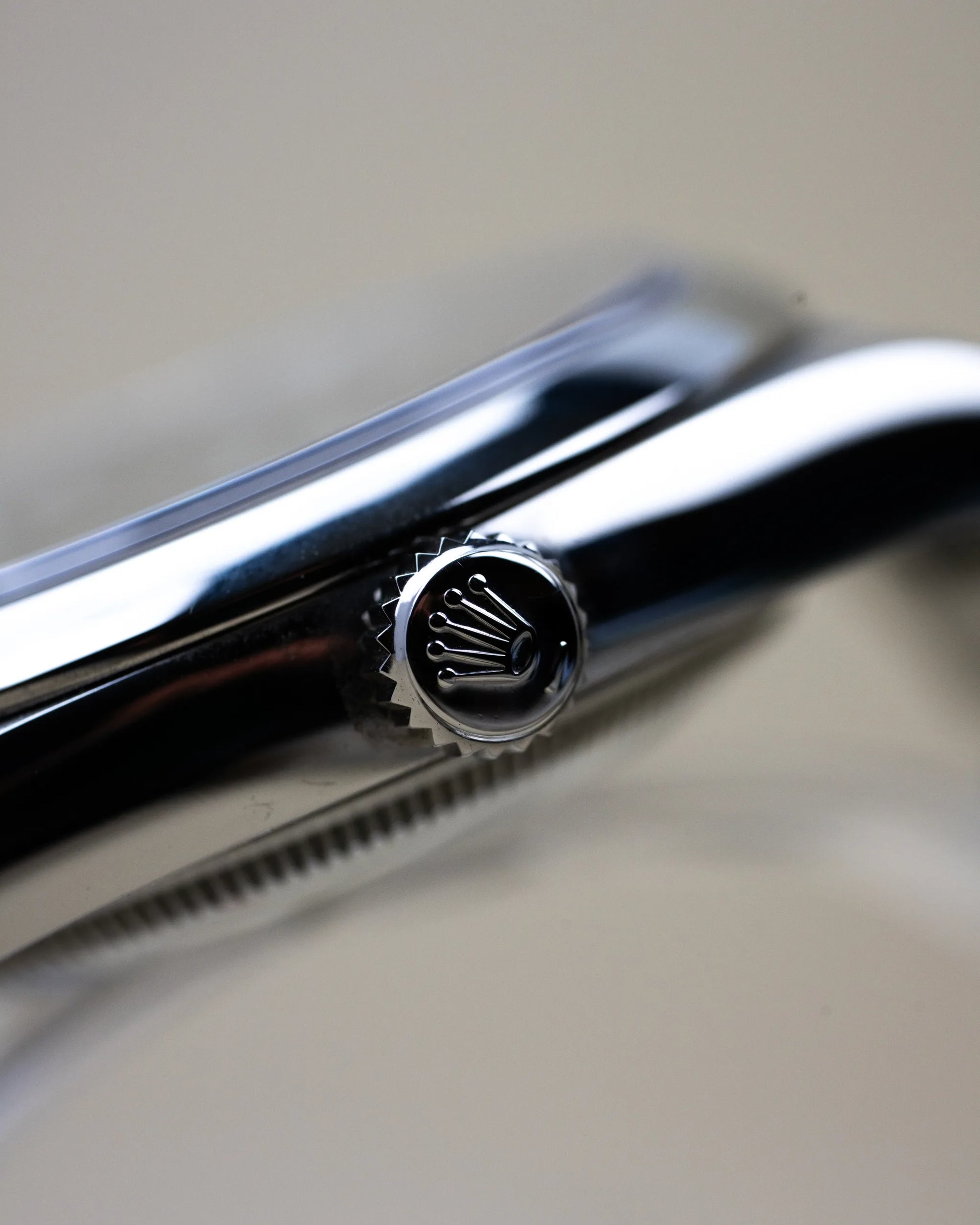 This reference embodies a harmonious balance of subtlety and timeless sophistication, featuring a polished 36mm Oyster steel case paired with an Oyster bracelet. Adorned with a smooth bezel, a sapphire crystal protecting the dial, and a crown with intricate detailing, the case exudes understated luxury.