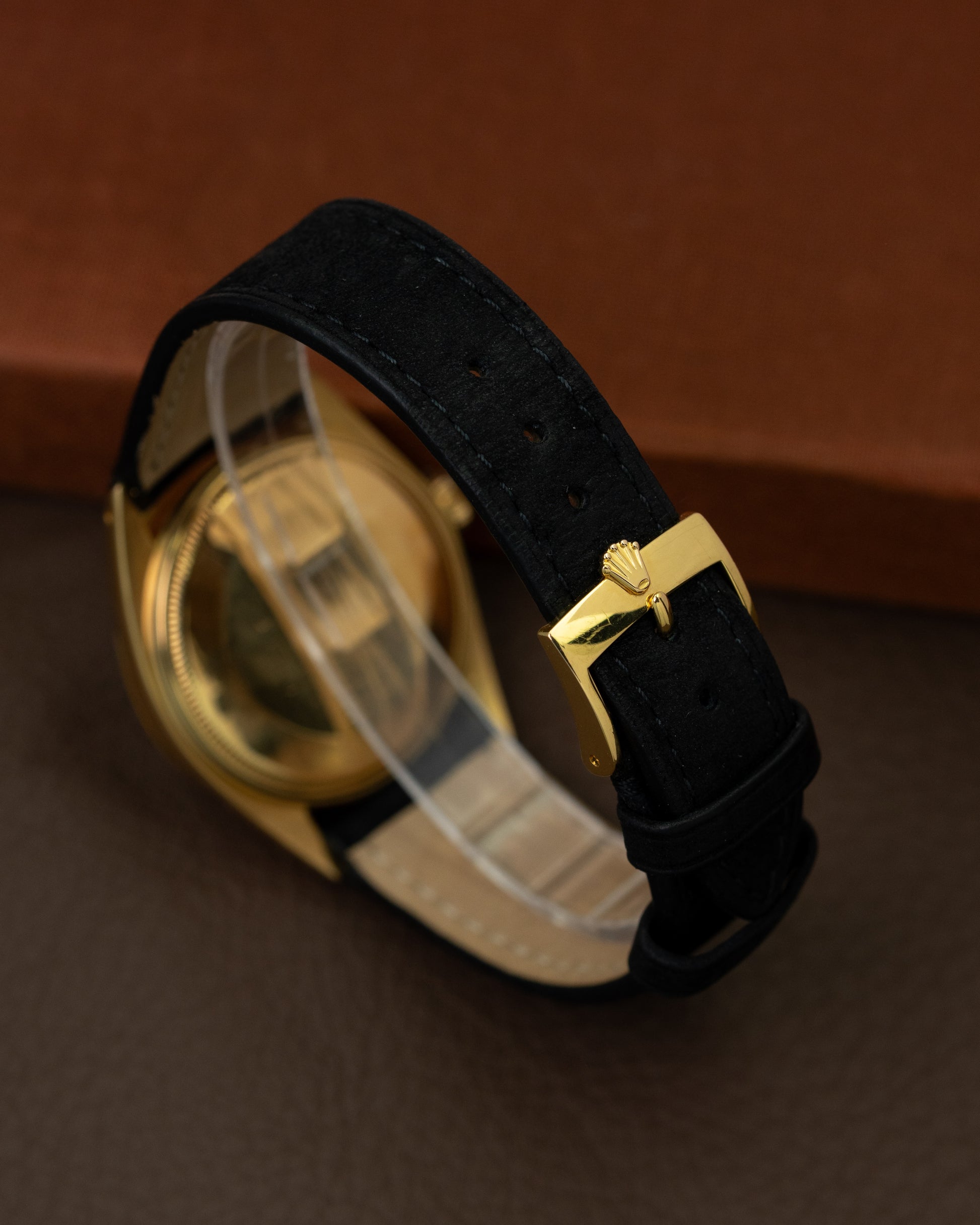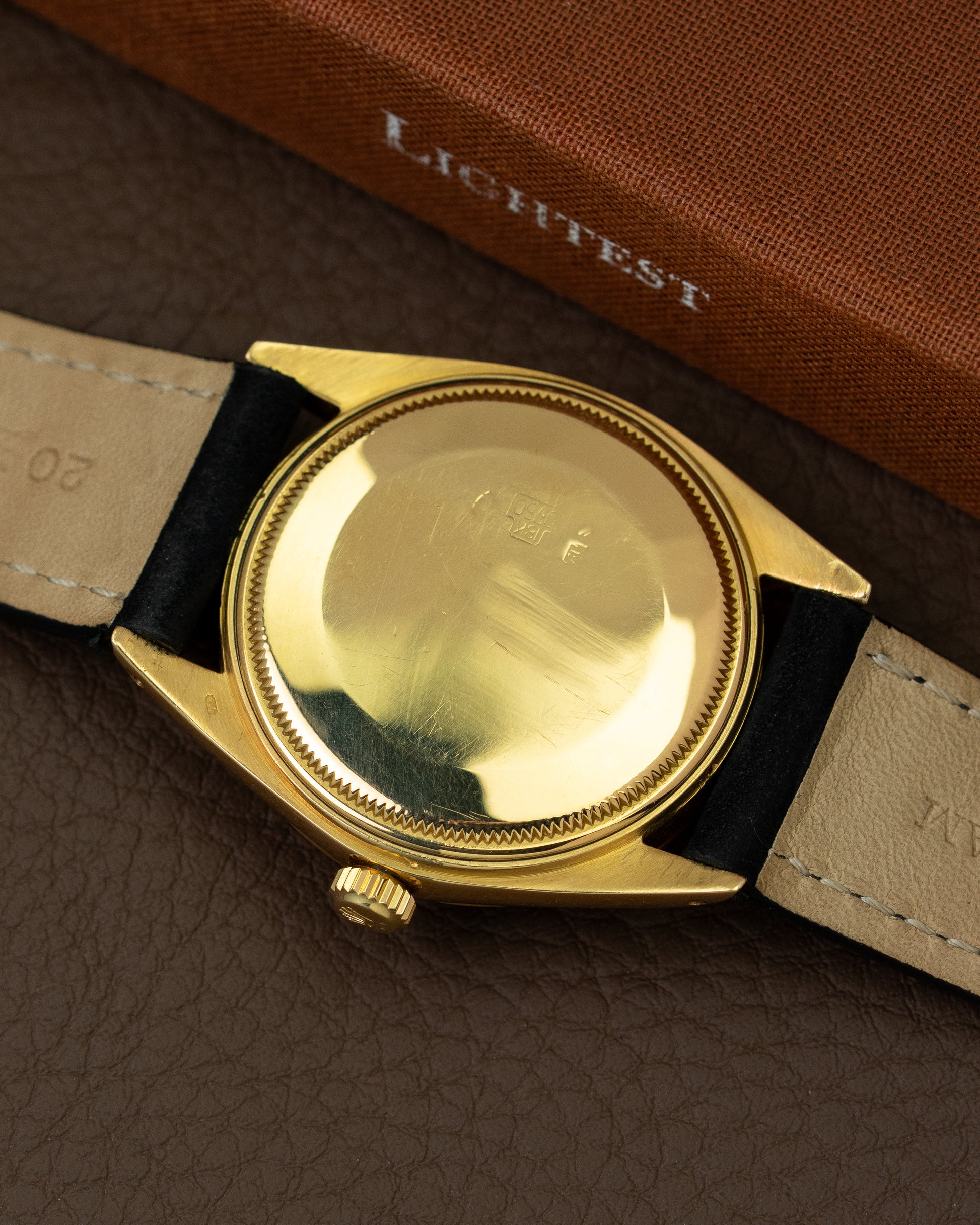 The Oyster Perpetual Date came in many different configurations, but this piece we are presenting to you is a very uncommon one. Housed in an 18K yellow gold case is a stunning matte dark grey sigma dial, the dauphine shaped hands together with this colour combination give this watch a very classic appeal. It is fitted on a suede strap matching the dial color, making this conversation piece very elegant to wear. Because of the automatic movement it is also a perfect daily beater.