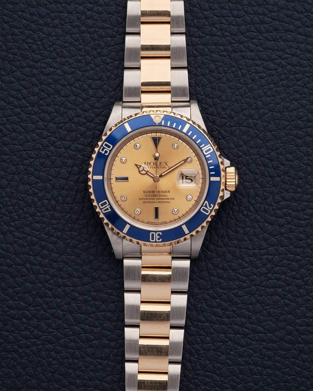 We are proud to present you our Submariner 16613LB champagne Serti dial. This extraordinary configuration is definitely something you will not see every day. A two tone submariner with blue accents and a diamond/sapphire set dial.