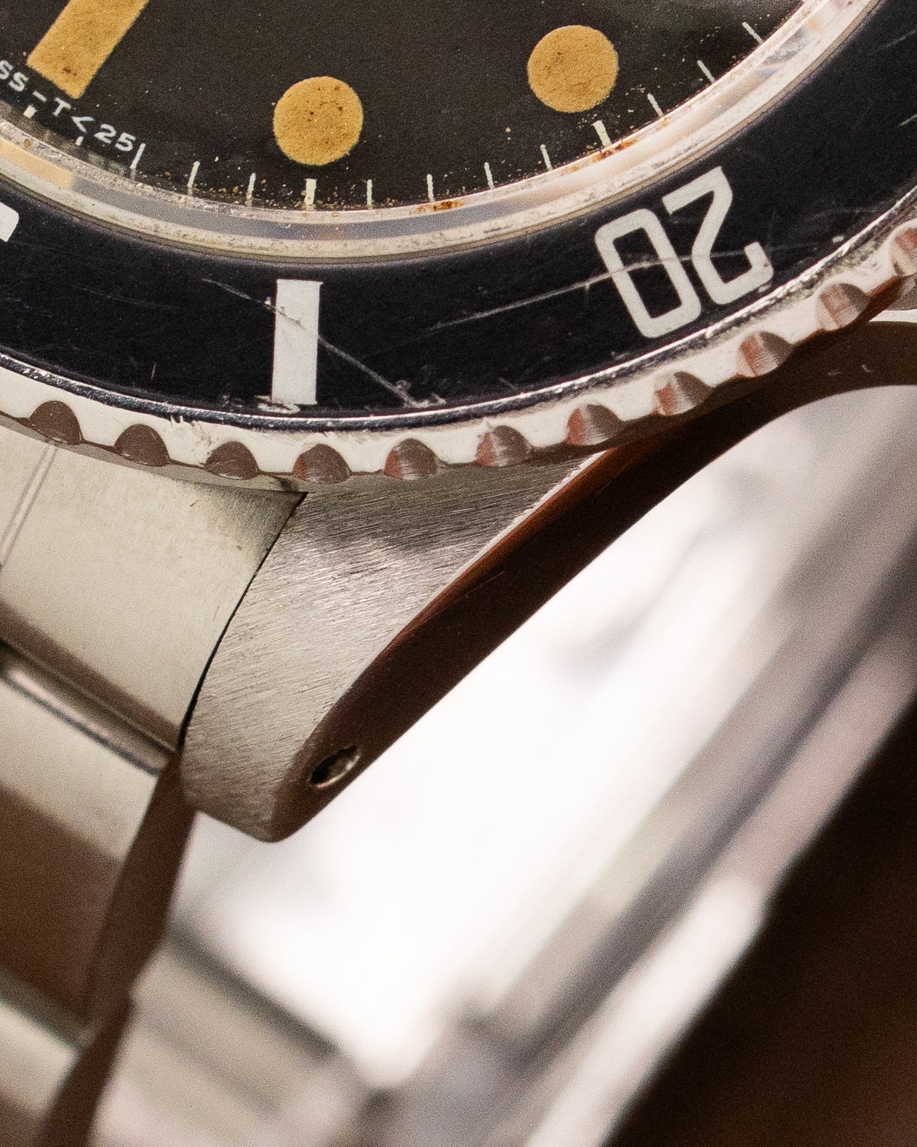 The hour markers on this example have developed a warm, pumpkin-ish patina that matches the lime on the hands. A rare find, as many of these dials were replaced with later service dials over the years. The bezel insert remains deep black, while the pearl has aged beautifully to an amber tone.