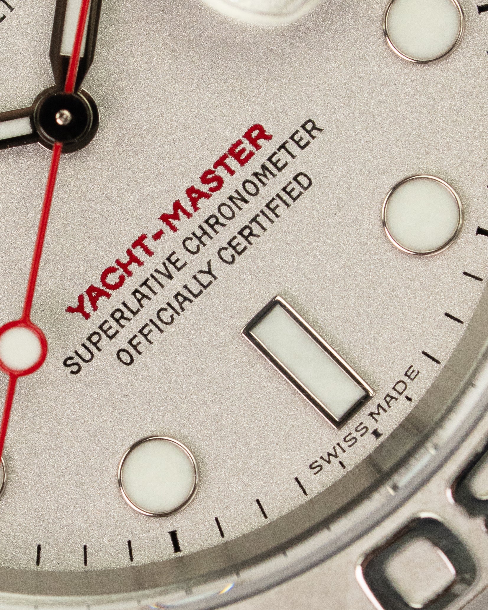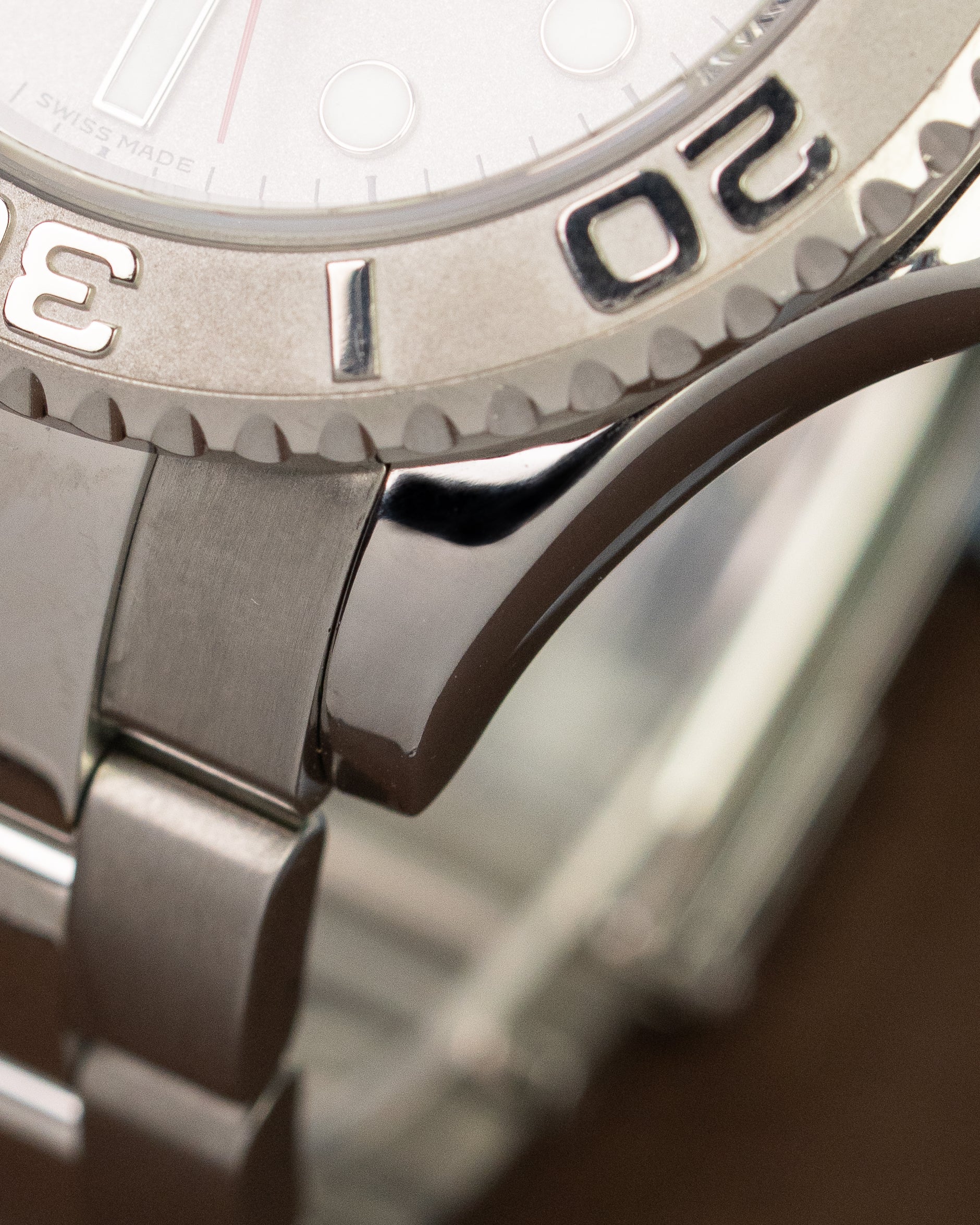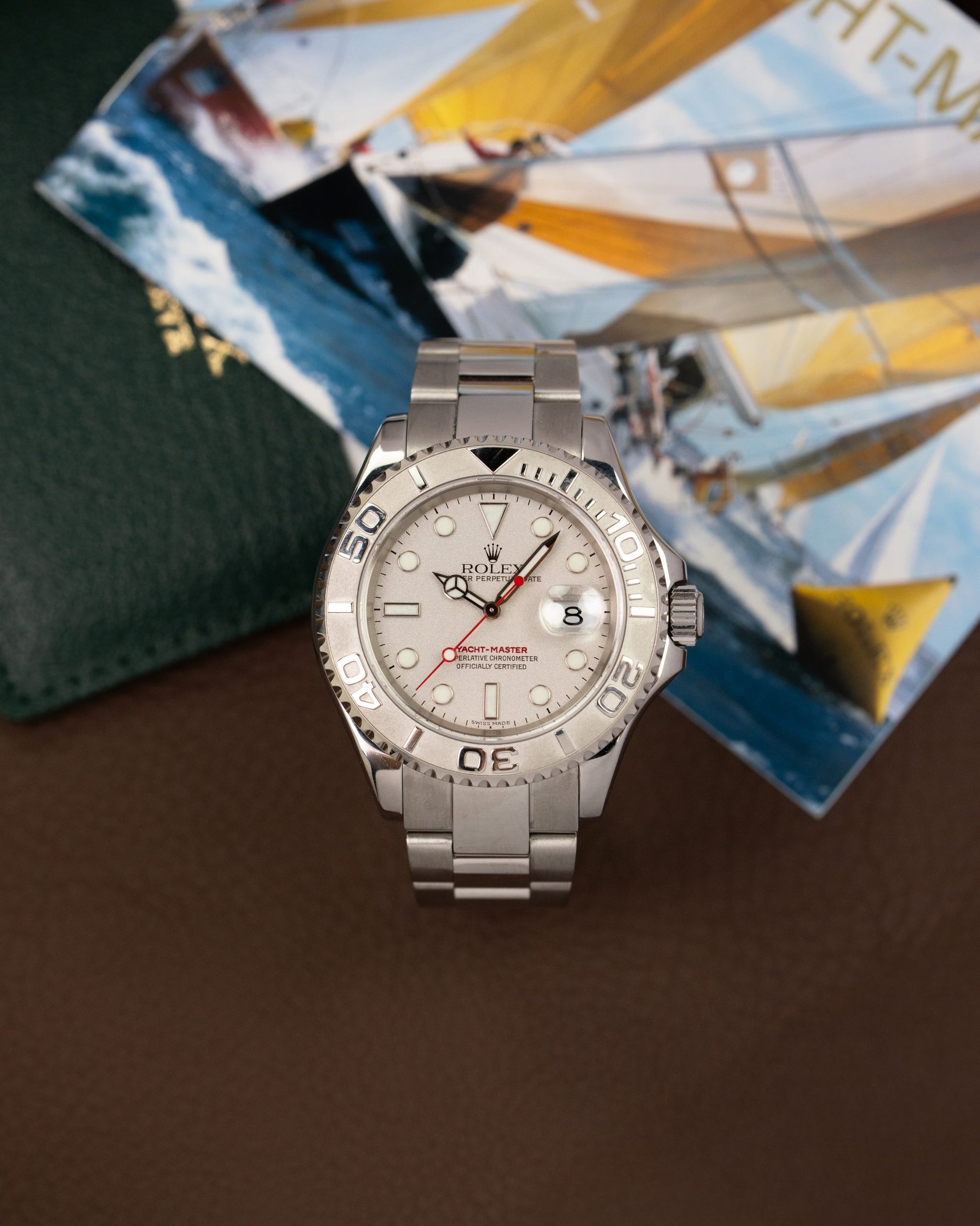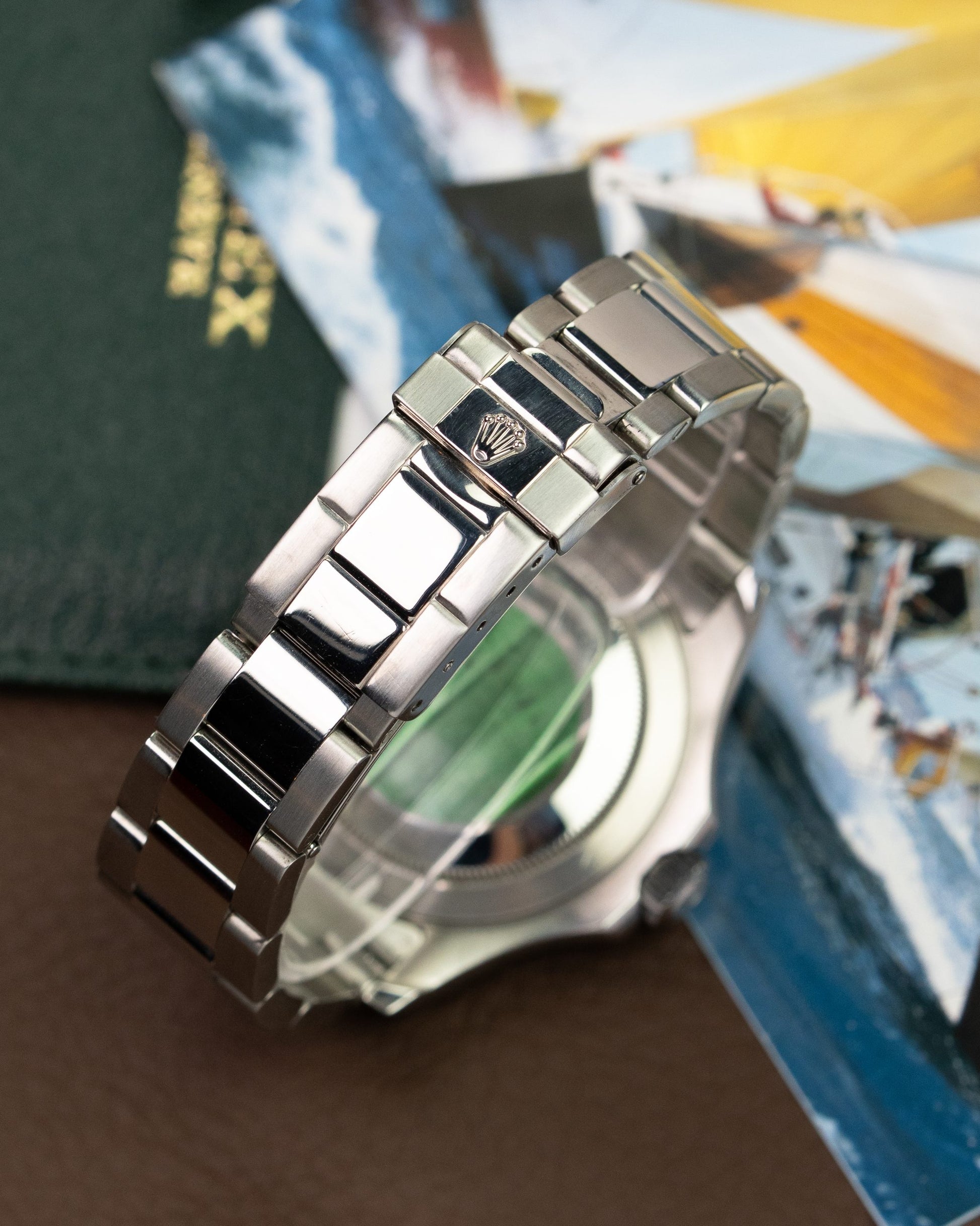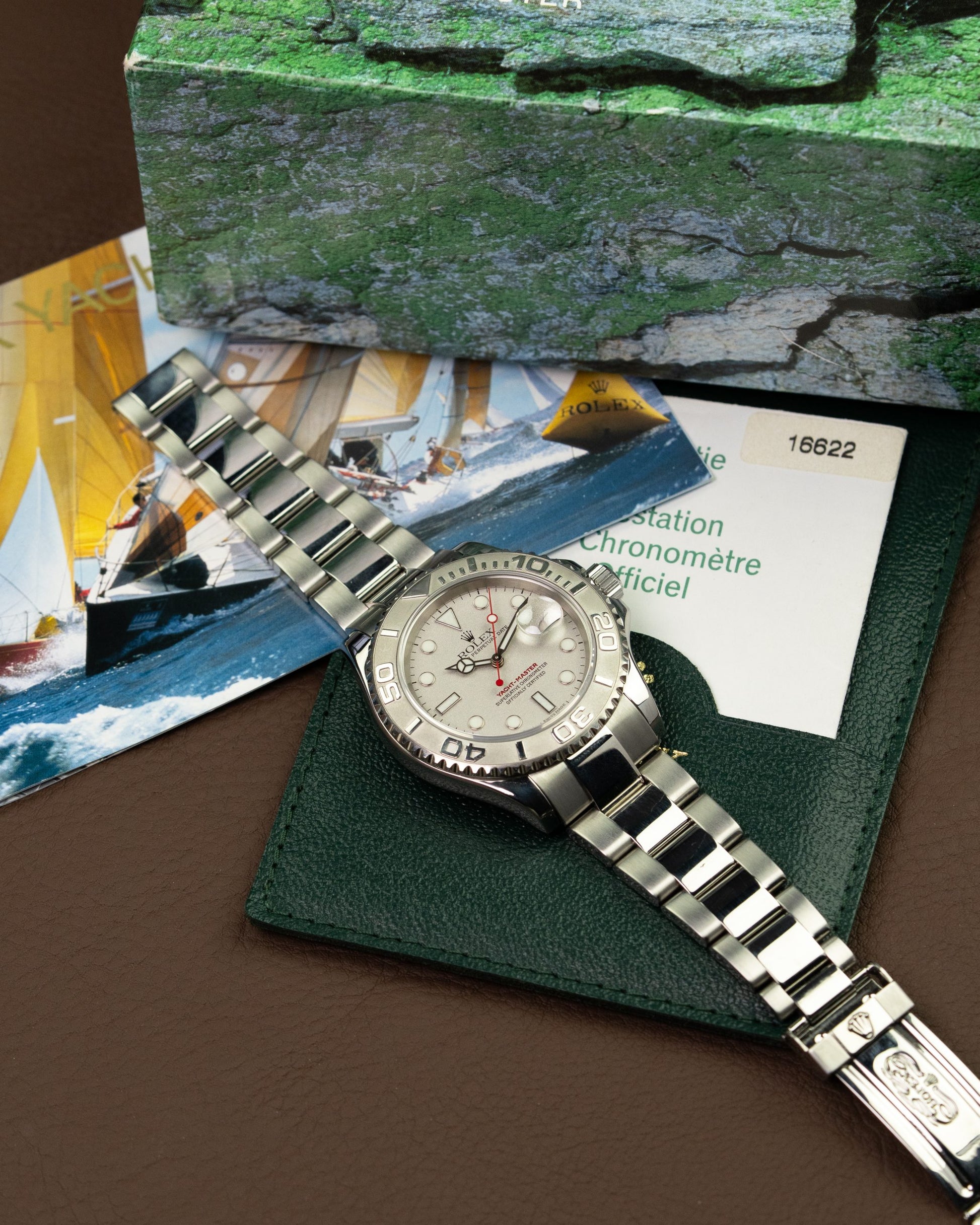 Released in 1999, the Yacht-Master 16622 was the first model to feature what Rolex calls “Rolesium”, a mix of stainless steel and platinum. The case and bracelet are made from steel, while the bezel and dial are solid platinum.