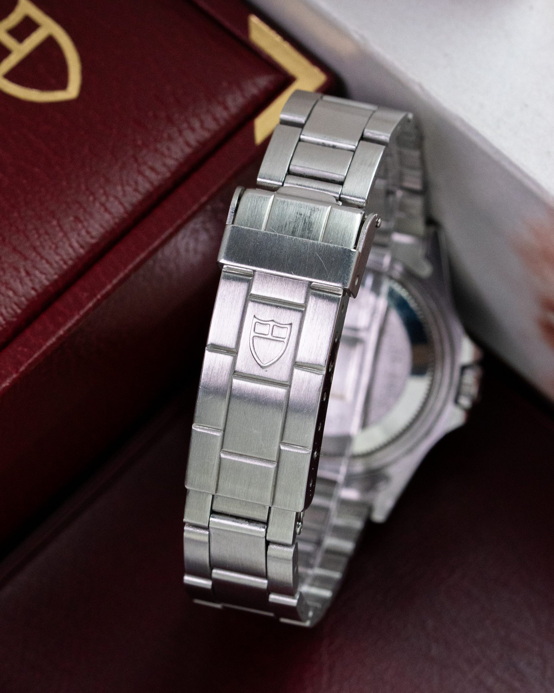 What makes the 73090 especially interesting is its blend of Tudor identity with unmistakable Rolex DNA. As part of the era when Tudor was closely linked with its parent company, this Mini-Sub comes with several Rolex-patterned parts, including the signed Rolex crown and Rolex caseback. The Oyster-style case and bracelet design also echo the same robust construction seen in Rolex Submariners of the time. The dial is classic black, paired with a matching bezel and luminous tritium hour markers. The Mercedes hands and clean layout stay true to traditional dive watch aesthetics. Inside, the watch is powered by the automatic ETA 2671 movement, featuring a quickset date at 3 o’clock. A domed plexiglass crystal.