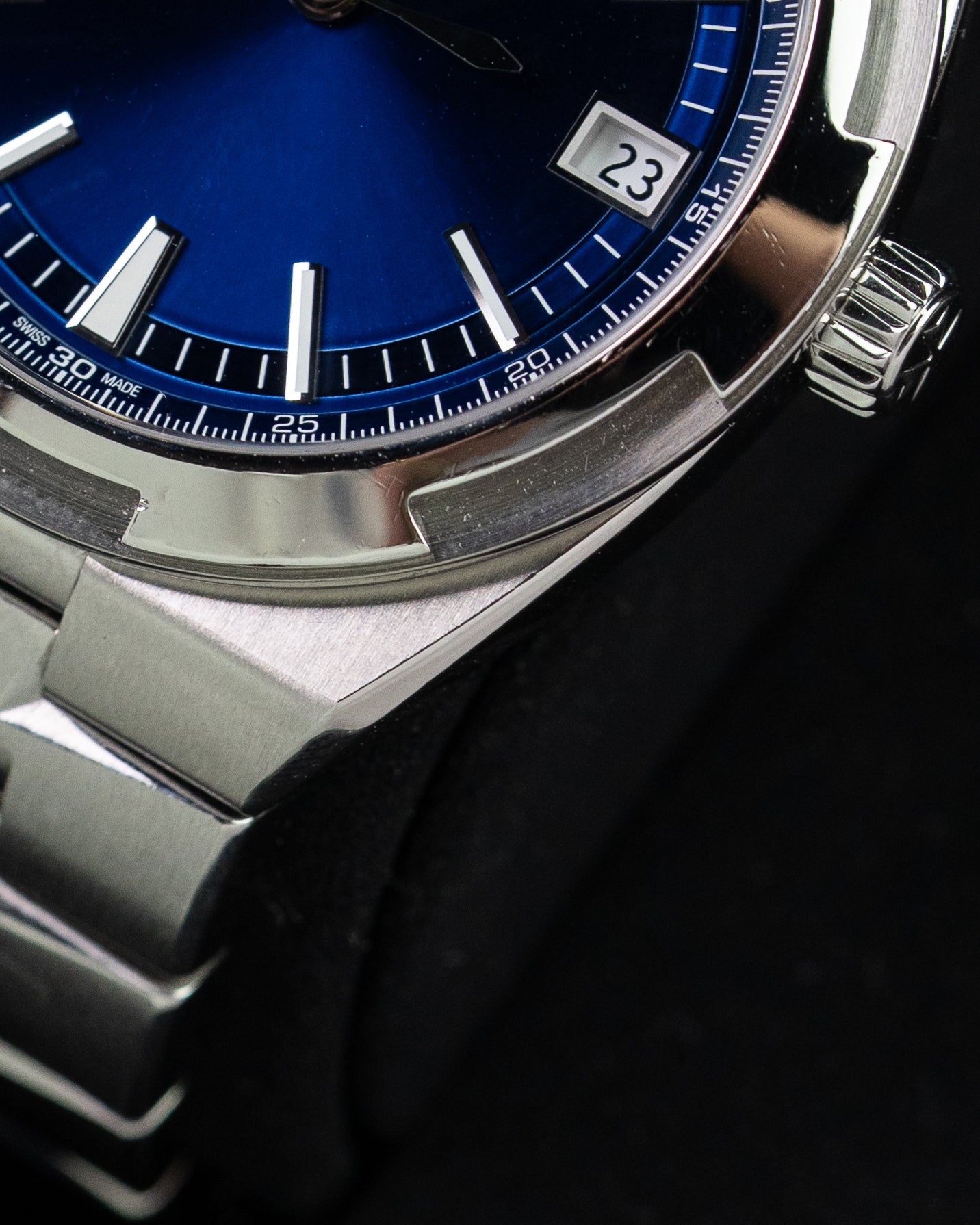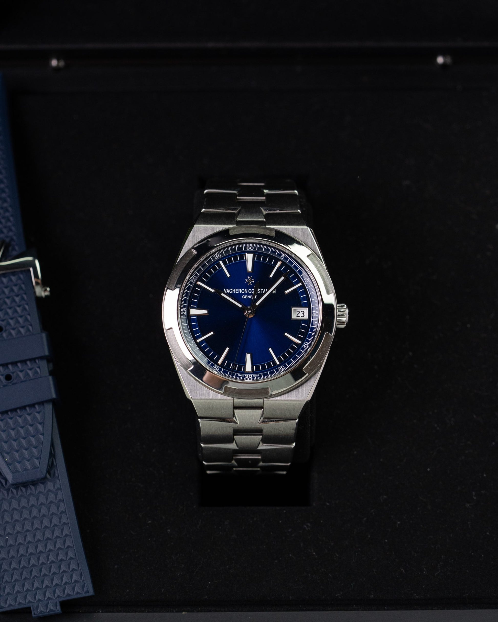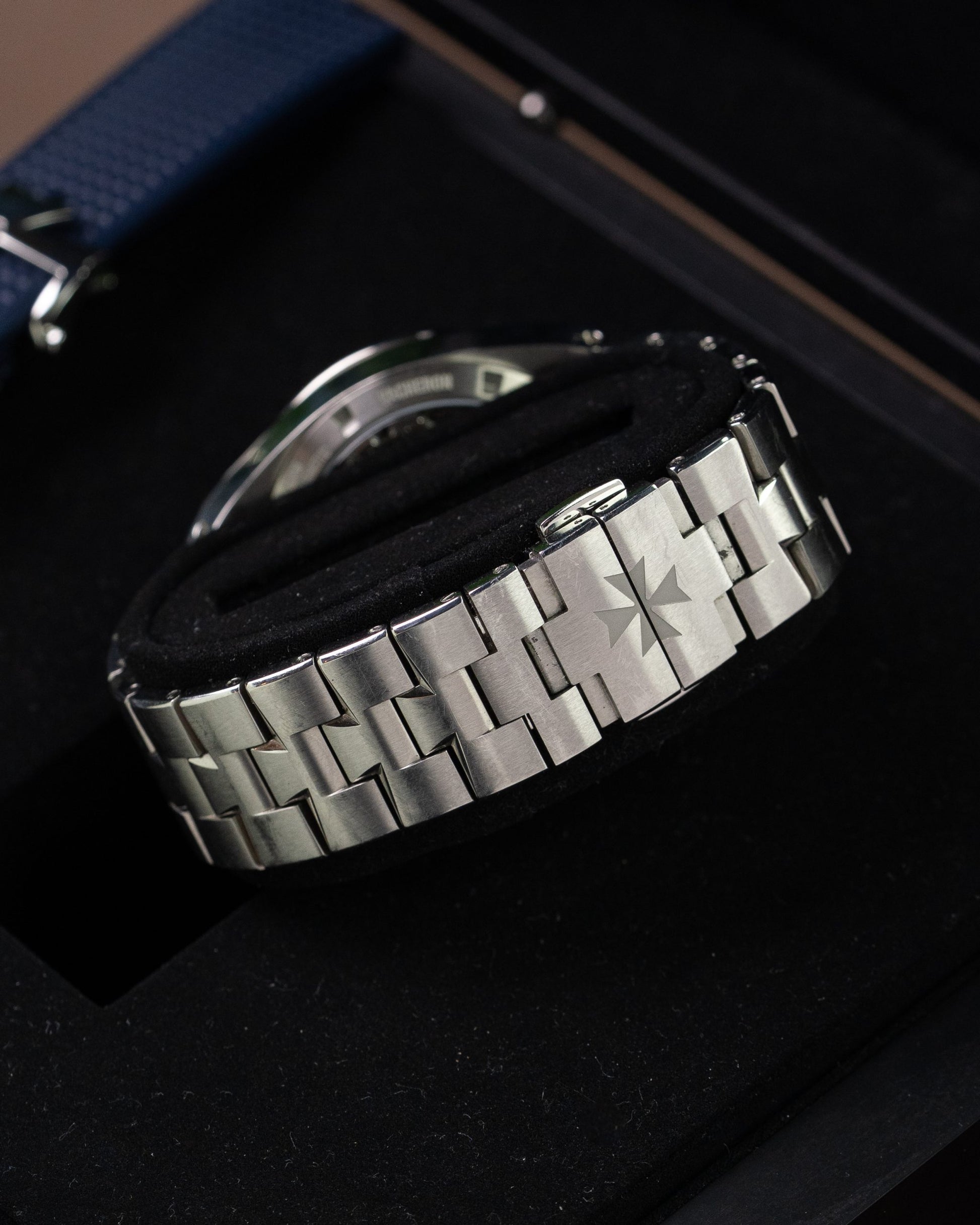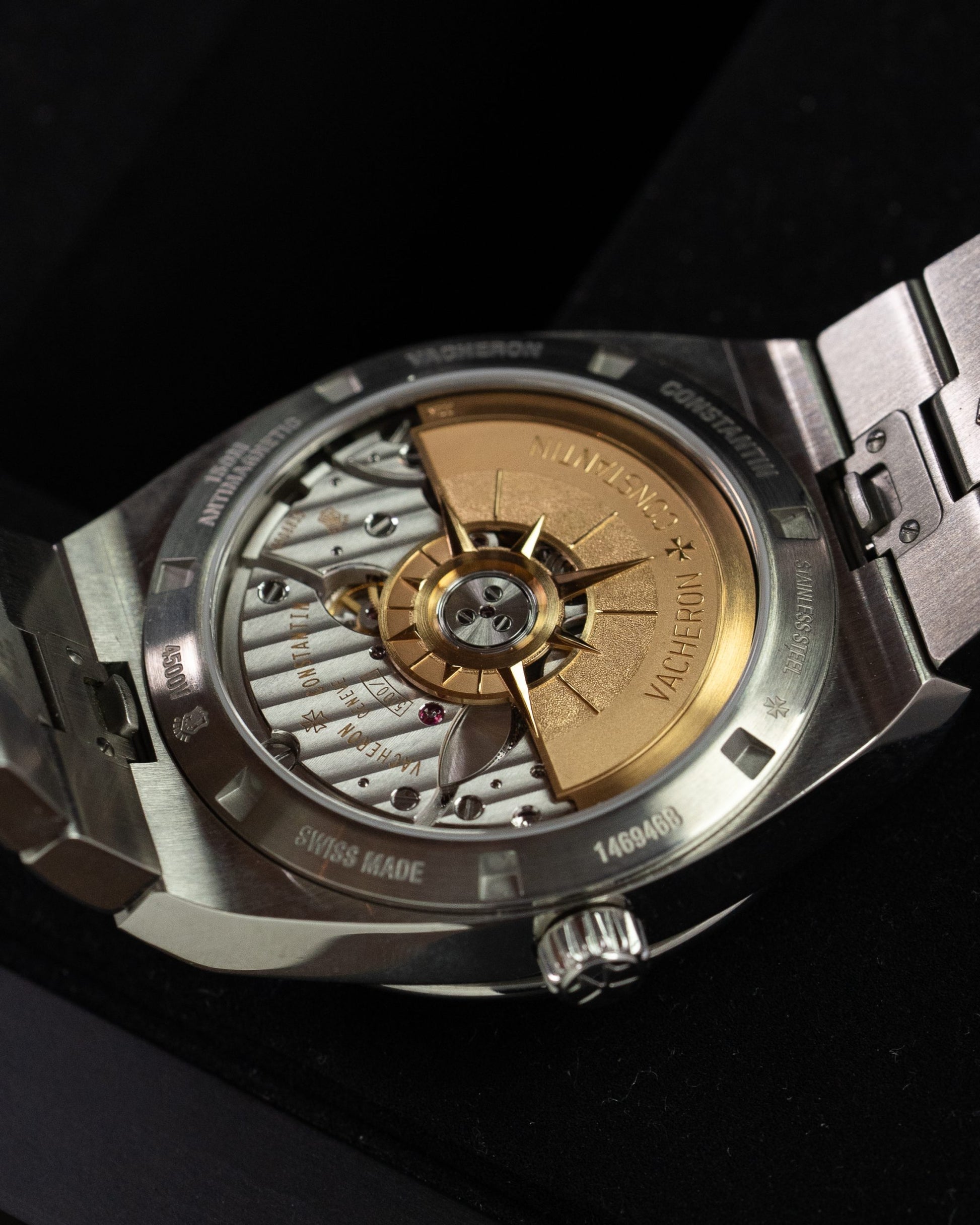 The Vacheron Constantin Overseas 4500V is a special watch made for both everyday use and special occasions. It has a 41mm stainless steel case with a mix of polished and brushed finishes, and a unique bezel shaped like the Maltese cross, a symbol of the brand. The watch is powered by Vacheron Constantin’s own automatic movement, which you can see through the clear back. The movement has a 22K gold rotor with a wind rose design, showing the watch’s travel-inspired spirit.